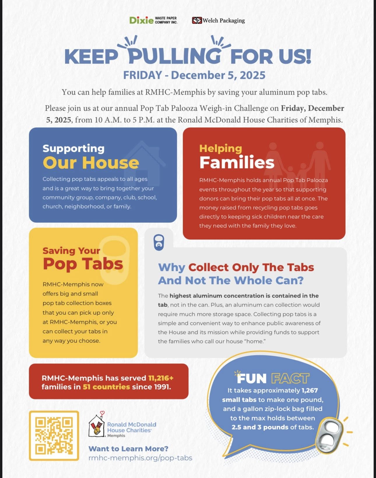 YPN is participating in "Keep Pulling for Us!" a charity drive supporting the Ronald McDonald House Charities of Memphis. You can help support RMHC-Memphis by saving your aluminum soda tabs and bringing them to the MAAR lobby. This drive runs through Dec. 5, 2025.