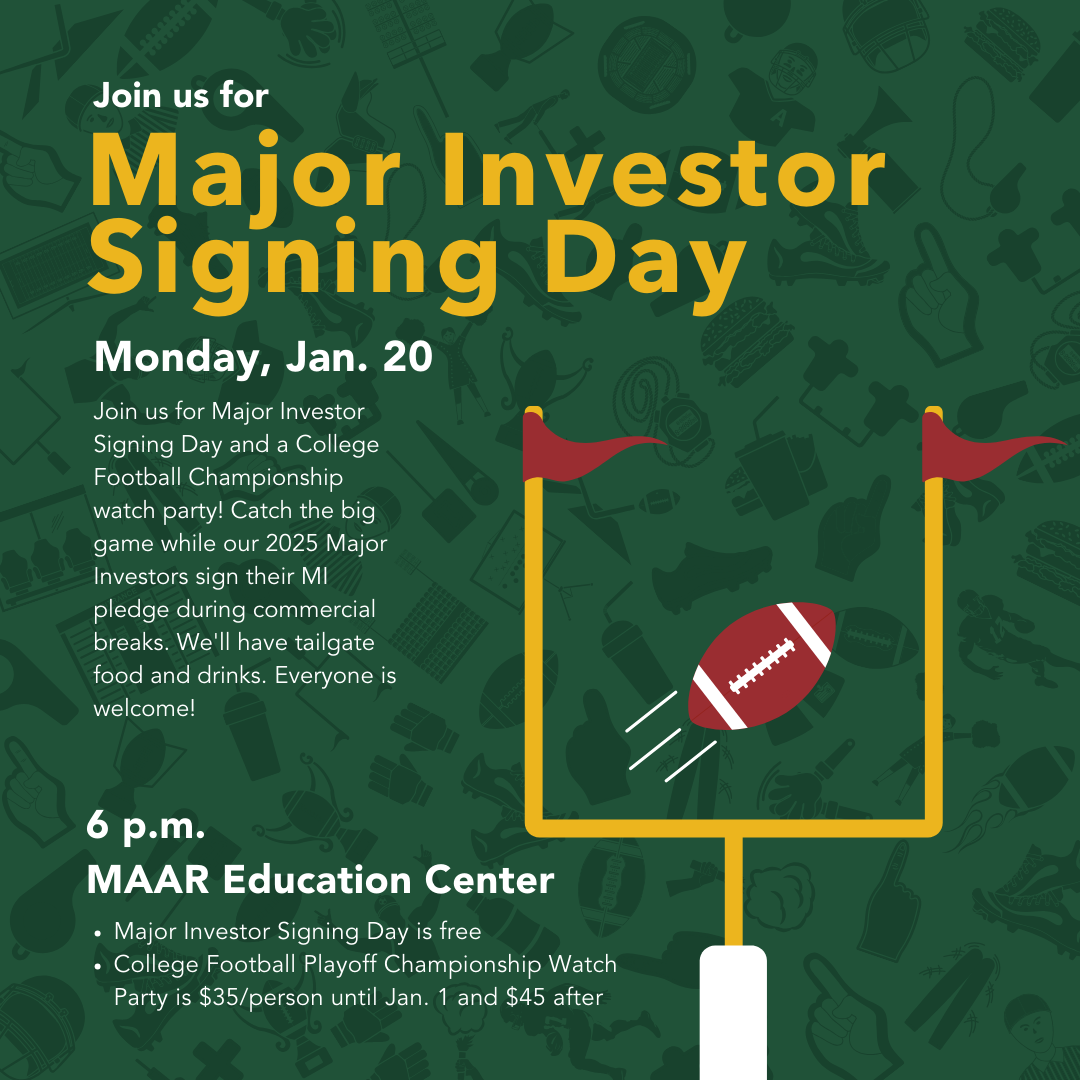 Join us for Major Investor Signing Day and a College Football Championship Watch Party! We are transforming the MAAR Education Center into a big living room with comfy seating, and will show the big game starting at 6:30 p.m. Our 2025 Major Investors will sign their MI pledge during commercial breaks! There will be tailgate food and drinks, with VIP drinks for our Major Investors. MAAR Members and their guests are welcome to attend!
