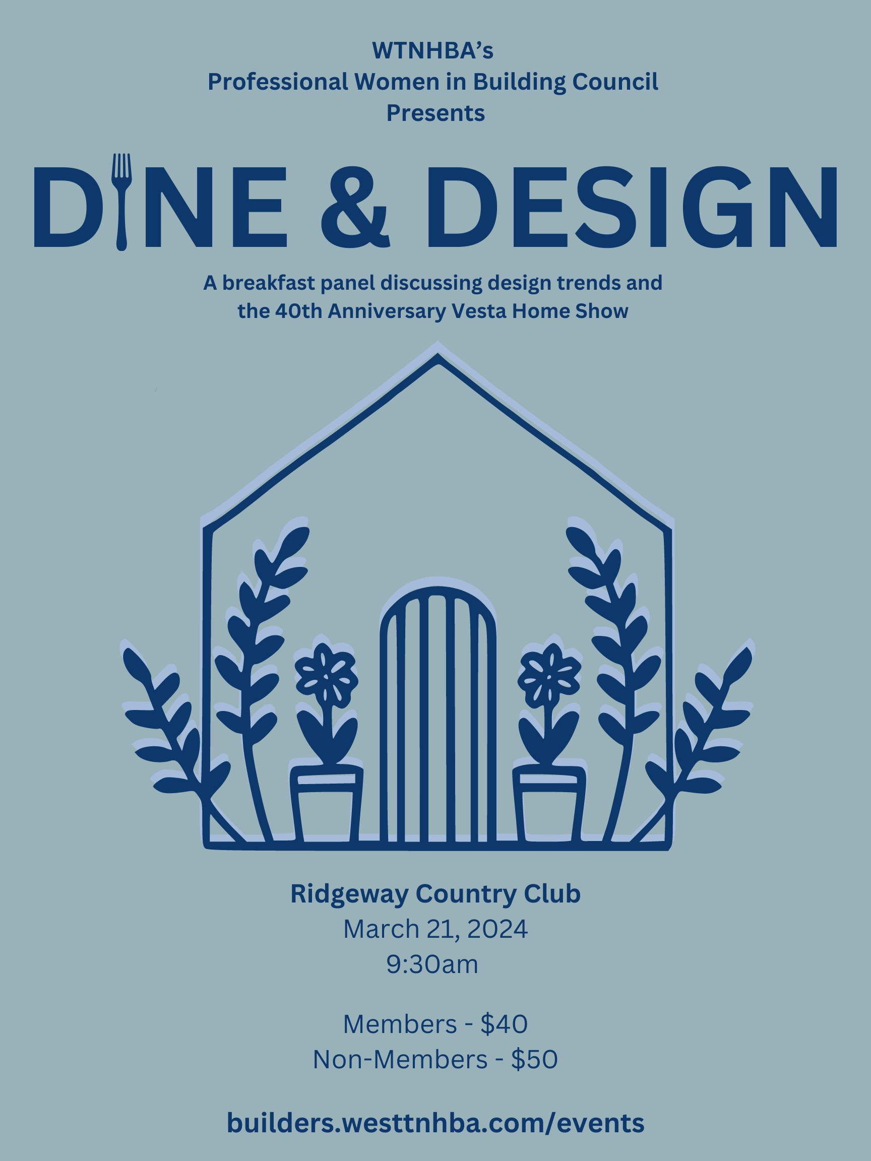 West Tennessee Home Builders Association's Professional Women in Building Council presents Dine & Design, a breakfast panel discussing design trends and the 40th anniversary Vesta Home Show. Visit builders.westtnhba.com/events to learn more.